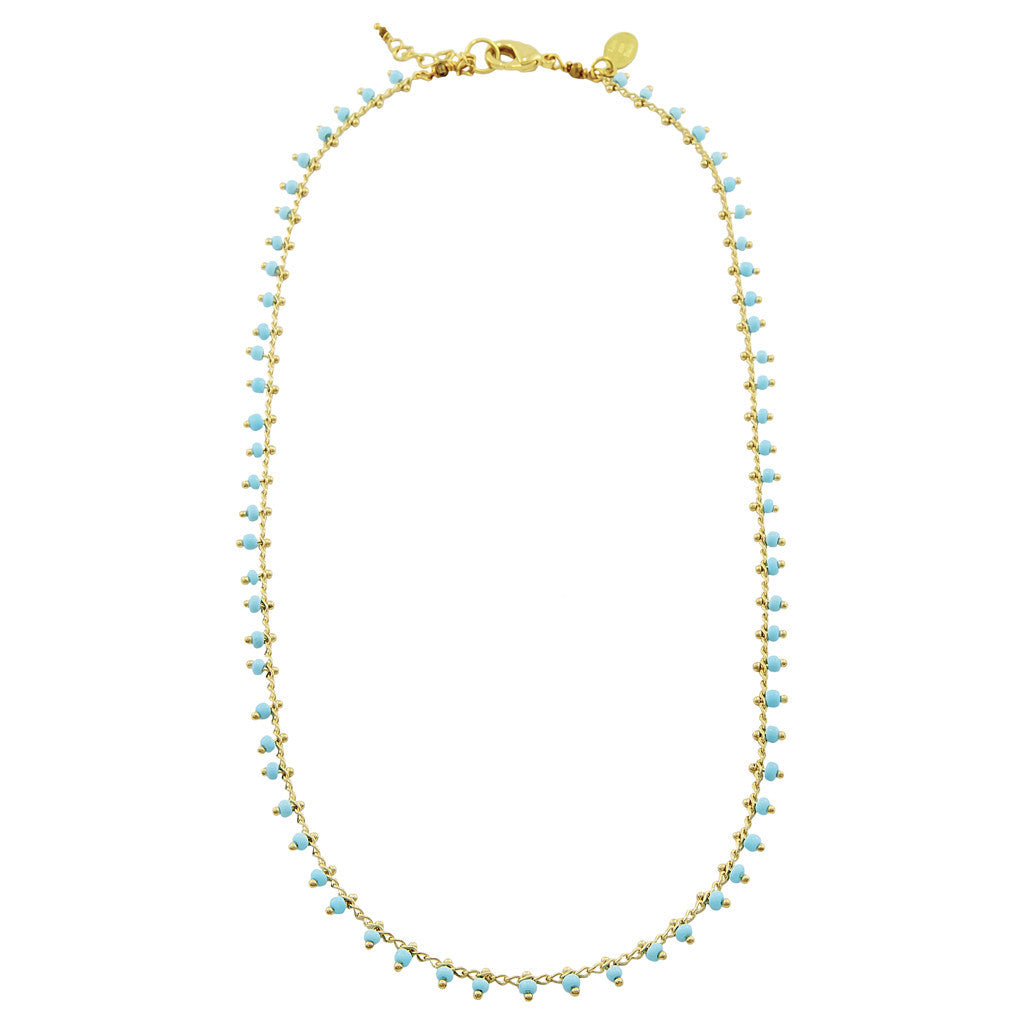 We think this beautiful turquoise beaded necklace is the perfect accompaniment to any holiday outfit! The chain and clasp are gold with an even pattern of small turquoise beads hanging from it.