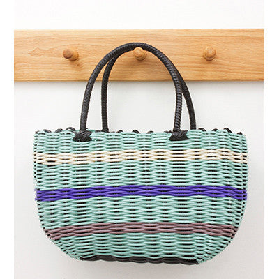 A durable and versatile shopping basket constructed from blue and white woven plastic making it super strong. A pretty design with different colours appearing in horizontal stripes and a black woven carry handle. This bag is so retro vintage we love it and think anyone carrying it around will be doing so in style.