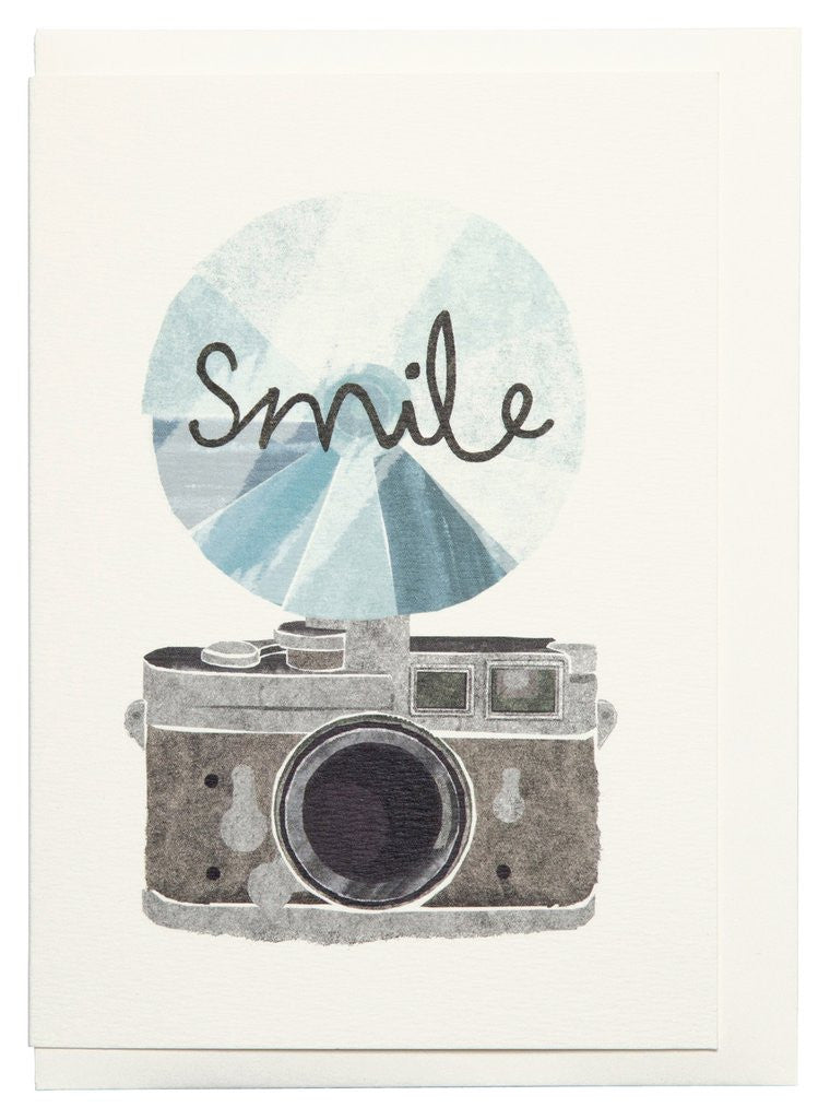 A super cool retro Camera Flash Card, with 'smile' written on the flash disc. Printed onto responsibly sourced card, presented in a cellophane wrap.