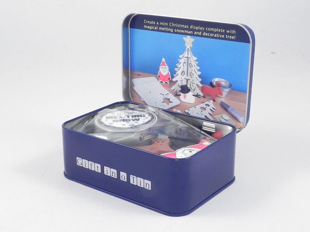 Make a melting snowman from reusable putty and a decorative wooden Christmas tree then complete the display with the Father Christmas and reindeer ornaments included in the tin.