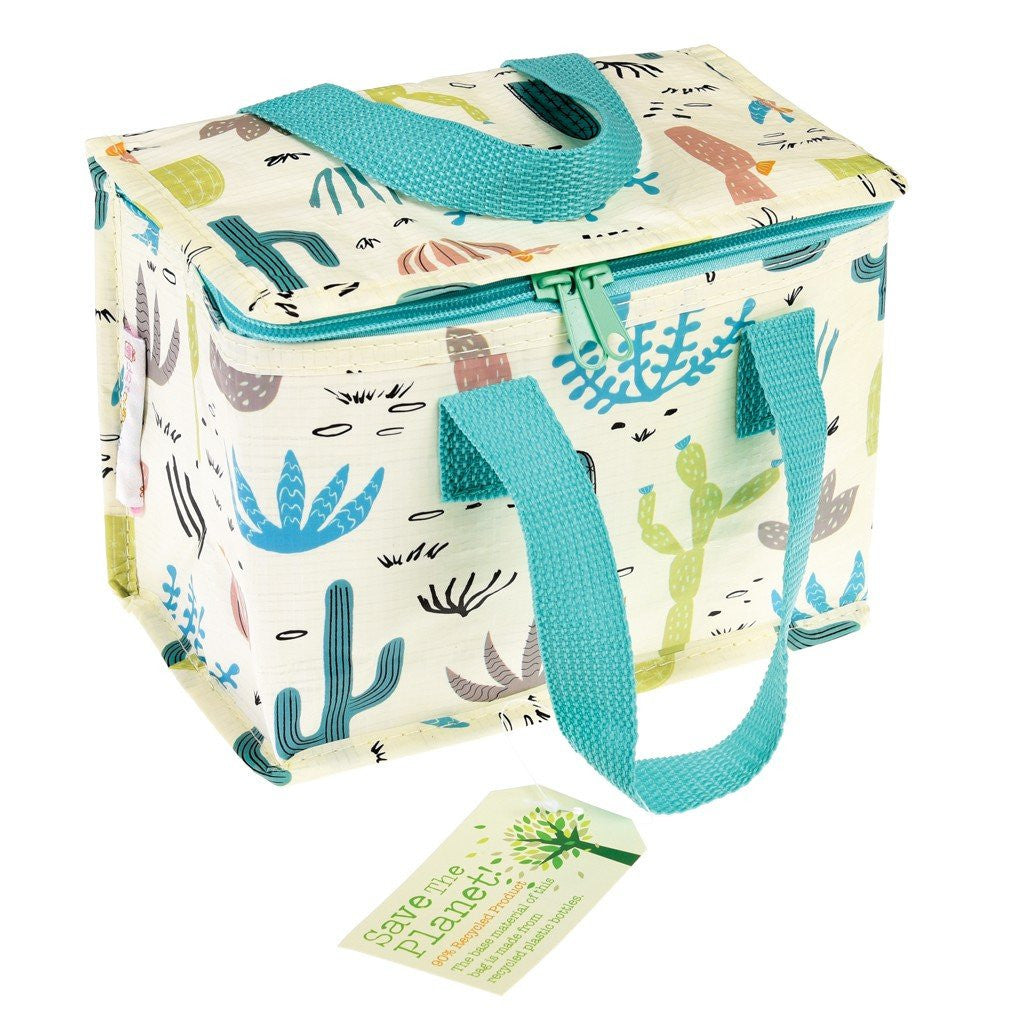 Colourful Cactus Lunch Bag with inner foil insulation to keep your kiddies lunch hot or cold. Also it's made from recycled plastic bottles! Good hey?