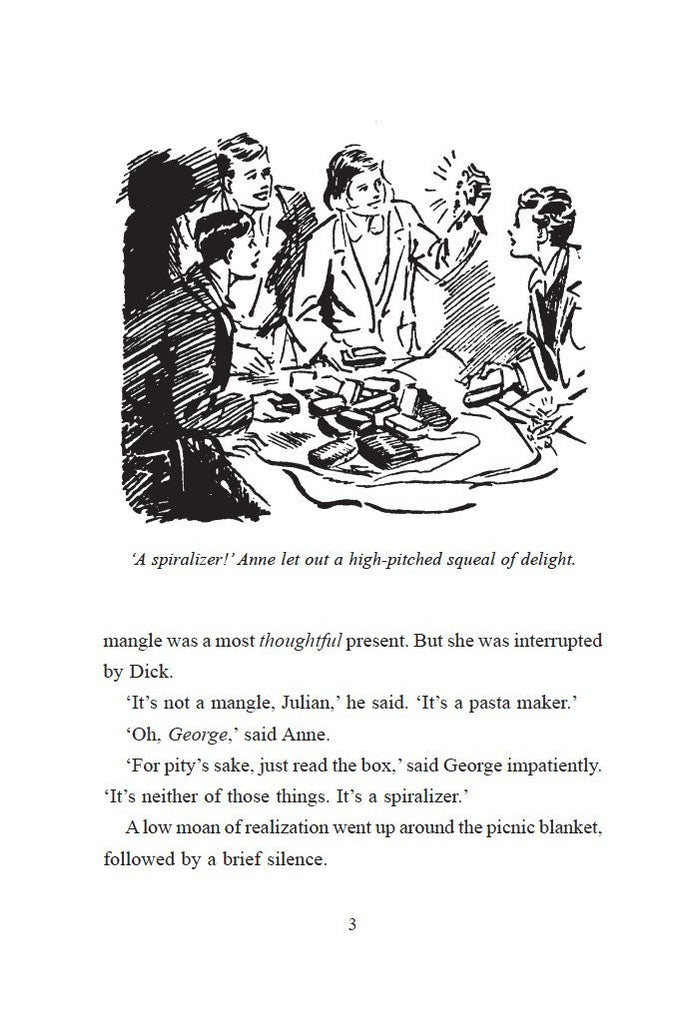 Julian, Anne, Dick, George and Timmy are all feeling really rather rum, and it's been going on for days. Nothing seems to work, and with their doctors mystified, they're driven to trying out various expedients to cure themselves. Julian goes online to self-diagnose that he's got pancreatic cancer, bird flu and Creutzfeldt-Jakob Disease. Anne decides that the old methods are the best and decides to have herself exorcised - which proves to be an awful lot of bother for everyone, and such a mess. Dick goes to a witch-doctor who calls himself a 'homeopath' ('sounds only one short of sociopath, Dick!') but it's George who discovers they need to go on an exclusion diet, so they enter a world of hard-to-find, maddeningly expensive specialist foods...