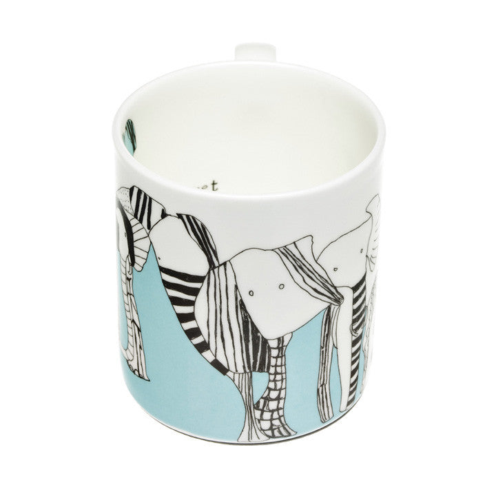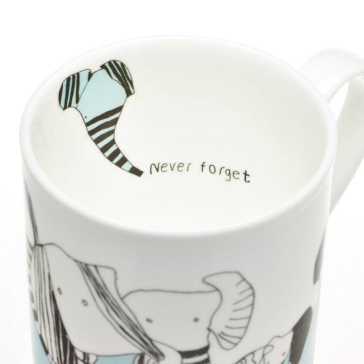 Elephants Never Forget Mug is a gorgeous creation by ARTHOUSE Meath. A family of elephants are hand drawn in black ink and printed onto a fine bone china mug in shades of blue and white. The words 'never forget' appear on the inside rim as a reminder that elephants - never do forget.