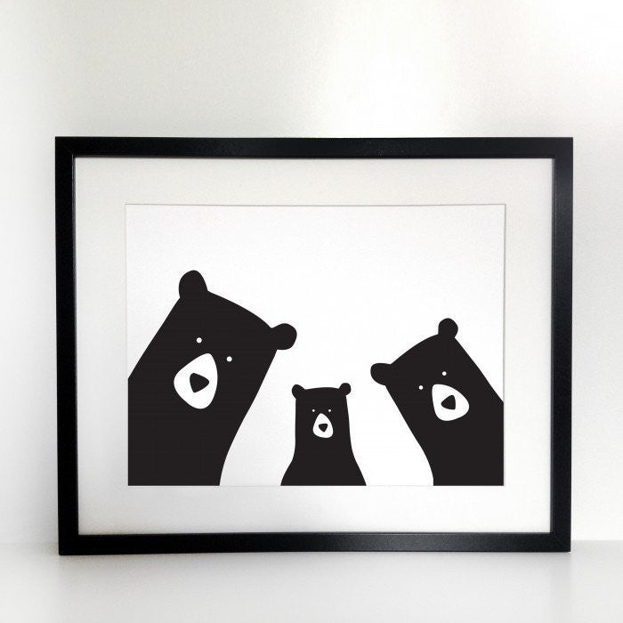 A very cute Family Bear Print for your home. The print is A3 in size and has two parent bears and one baby bear in black and white, all peeping up at you. A lovely gift for expecting families or loved ones in general.