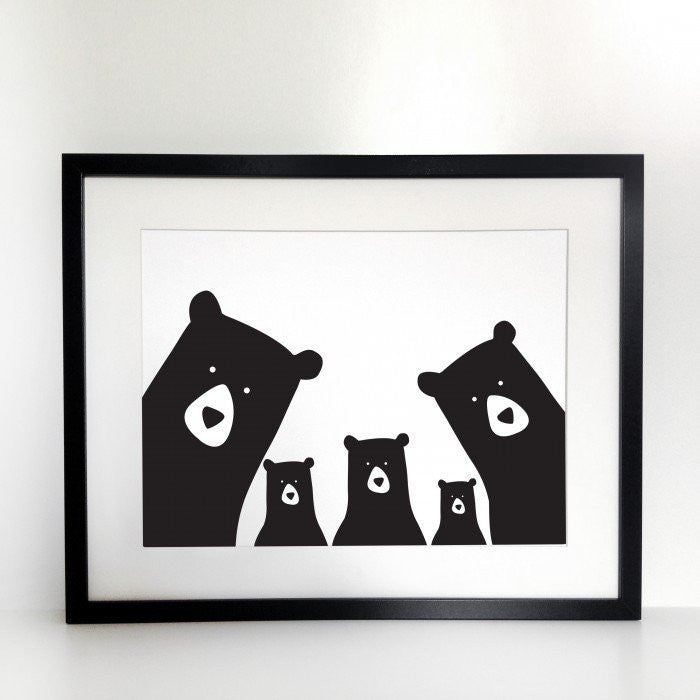 A very cute Family Bear Print for your home. The print is A3 in size and has two parent bears and three baby bears in black and white, all peeping up at you. A lovely gift for loved ones.